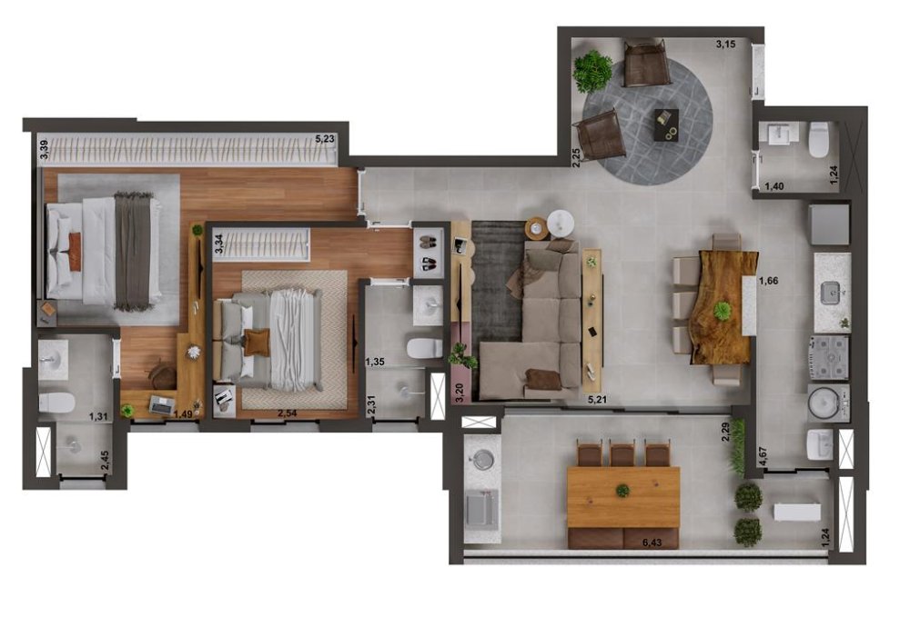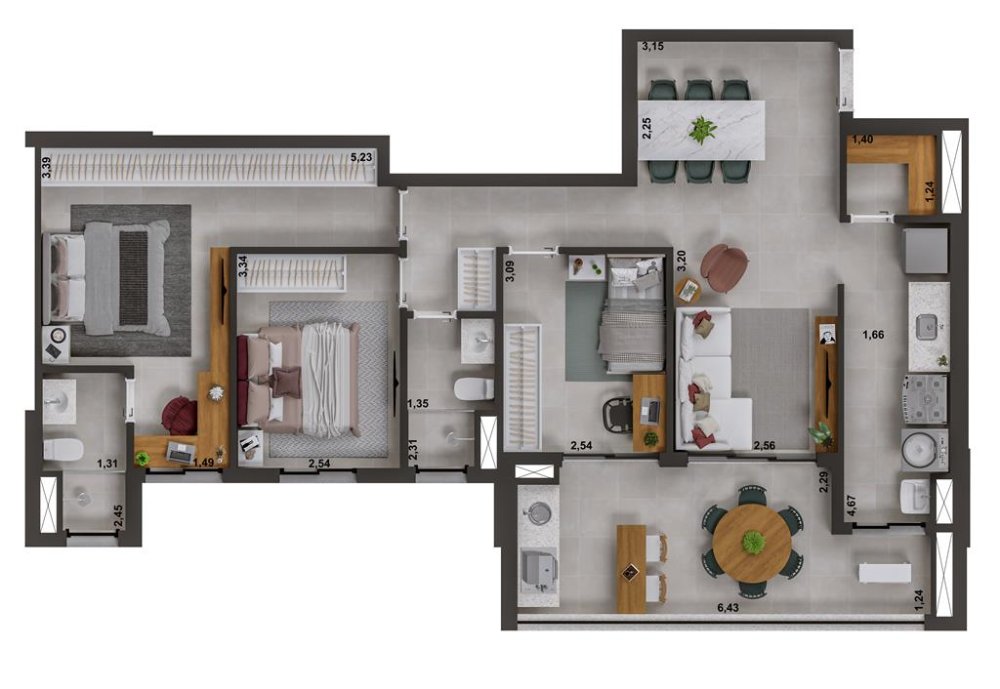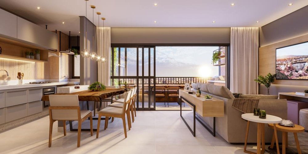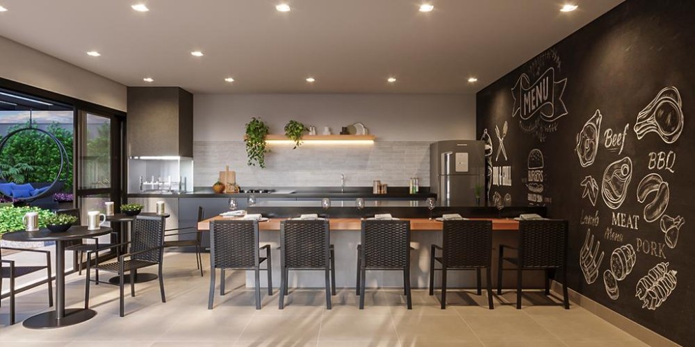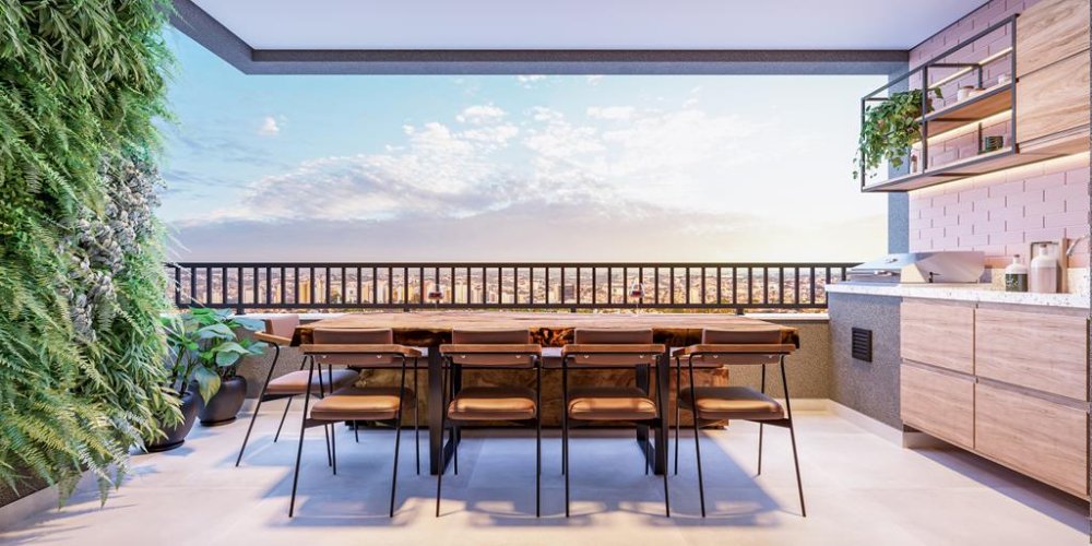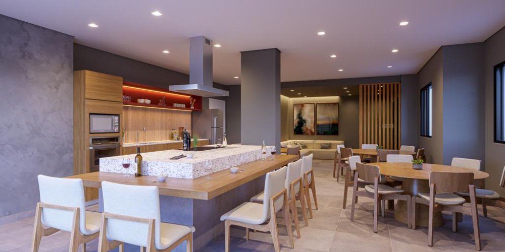 A sacada com churrasqueira é um convite para momentos de lazer e confraternização, enquanto a cozinha americana integrada otimiza o espaço e facilita a interação social.