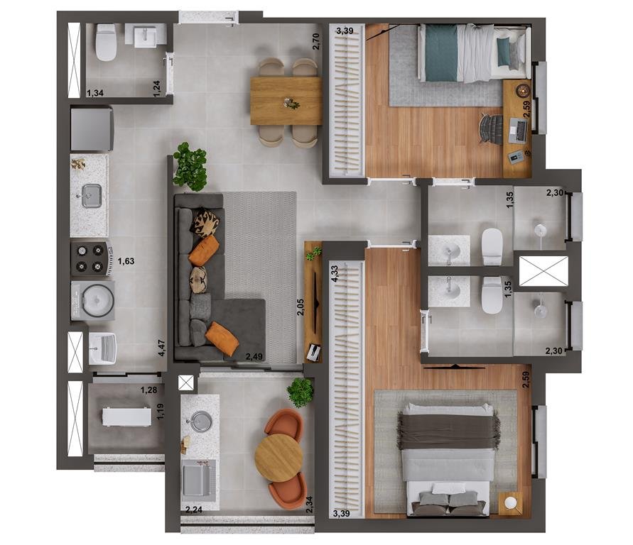 Este lançamento exclusivo, com 144 unidades distribuídas em 24 andares e apenas 6 apartamentos por andar, garante privacidade e conforto. Com uma área total de 69.03m² a  99.92m², este apartamento foi projetado para atender às suas necessidades e superar suas expectativas. Oferece plantas de 02 dormitórios ( 02 suítes )   ou  03 dormitórios ( 01 suíte ), verificando excelentes opções para você e sua família .