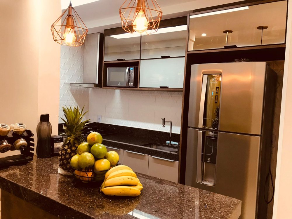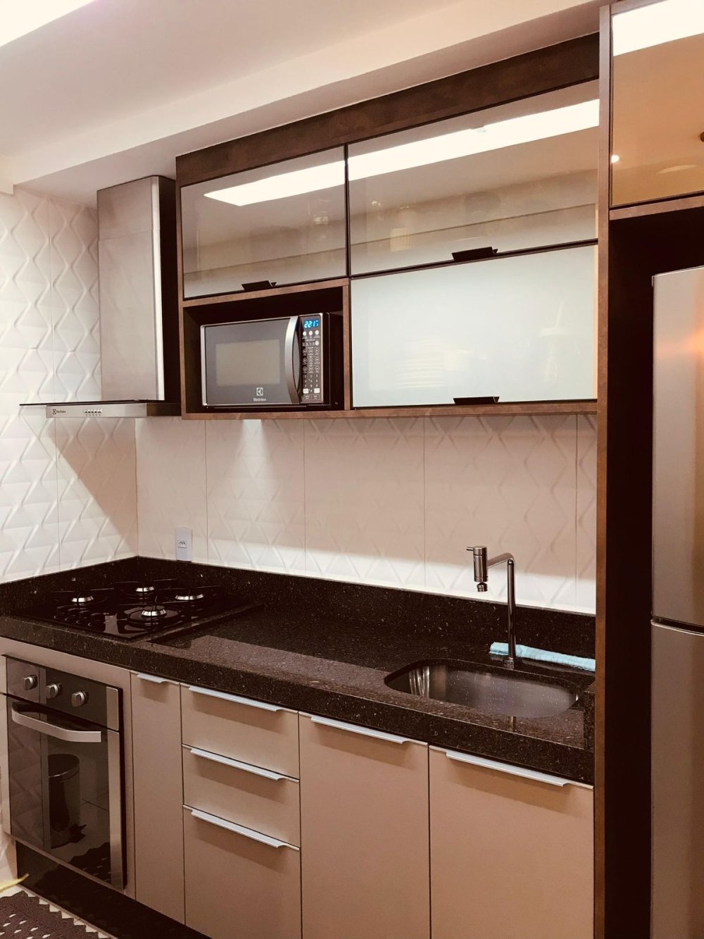 Cozinha toda mobiliada e equipada com Cocktop a gas, microondas, forno e depurador.