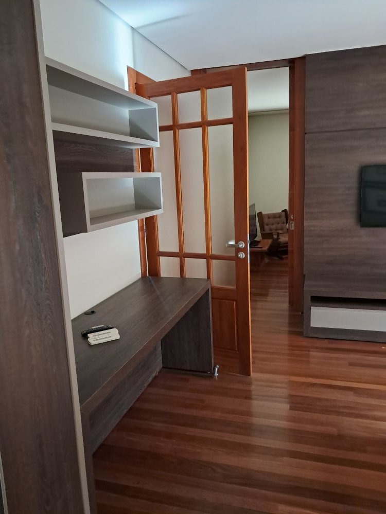 Armários em todas as suítes, cozinha, area de serviço, churrasqueira e sala.
